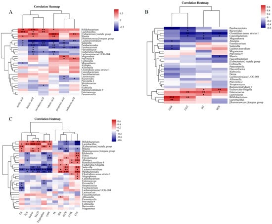 Correlations between SCFAs and tryptophan metabolites with top 30 abundance of gut microbiota during the RS2 fermentation. Spearman correlation heatmap of (A): gut microbiota and SCFAs, (B): gut microbiota and gas production and (C): gut microbiota and tryptophan metabolites. Experimental treatments included: NC (negative control, 0 g/L), LRS2 (5 g/L), MRS2 (10 g/L), and HRS2 (15 g/L) of Hi-Maize 260 (n = 8 per group, with 4 female and 4 male replicates). One-way ANOVA with Tukey’s post hoc test was performed. Significant correlations were marked by * p < 0.05; ** p < 0.01; *** p < 0.001. Absence of symbols denotes no significant difference among the four groups.
