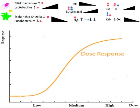 Dose-dependent effects of RS2 on pH, gas, tryptophan metabolites and their correlations with key microbiota. TRP, tryptophan; KYN, kynurenine; 2-OX, 2-oxindole; ILA, indole-3-lactic acid) across different RS2 doses (low, medium, high). Upward arrows indicate a trend of increasing concentration with higher RS2 dose, while shaded shapes indicate a trend of decreasing/increasing concentration. Shape and color identity represents a significant positive correlation (p < 0.05). Shape identity with inverse color represents a significant negative correlation (p < 0.05). Genera are represented by shapes: circle (Bifidobacterium), triangle (Lactobacillus), square (Escherichia-Shigella), and diamond (Fusobacterium). Downward arrows indicate a trend of decreasing concentration with higher RS2 dose. Right-pointing arrows represent a change in trend.