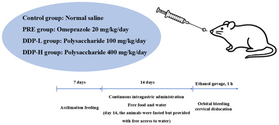 Gavage administration was conducted every morning, with a dosage of 2 mL per rat. The blank group received the same volume of normal saline via gavage, and the gavage was continued for 14 consecutive days. During the administration period, the rats had free access to food and water, and the environmental temperature was controlled between 25 and 30 °C. On the 14th day of gavage, the rats were fasted but allowed to drink water. On the 15th day, the rats were gavaged with 95% anhydrous ethanol; 1 h later, blood was collected from the orbital venous plexus, and the rats were sacrificed by cervical dislocation. The blank group was not gavaged with 95% anhydrous ethanol. One hour after intragastric administration, the gastric cavity was opened by incising along the greater curvature of the stomach. The gastric contents were rinsed thoroughly with normal saline, and the stomach was then flattened on filter paper for observation. Cases with no damage were excluded: if the gastric mucosa of rats in the model group appeared smooth without defects or hyperemia, it indicated that the ethanol-induced gastric ulcer model failed. As shown in Figure 1.