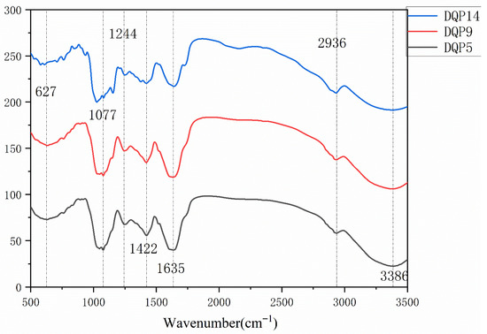 As illustrated in Figure 3, the crude polysaccharides from the three samples displayed similar FT-IR spectral characteristics. A broad absorption peak was observed in the range of 3500–3000 cm−1, corresponding to the stretching vibration of hydroxyl groups (O-H). This feature not only confirms the presence of hydroxyl groups in the polysaccharides but also verifies their hydrophilicity. Specifically, the broad absorption peak at 3386.55 cm−1 in the spectrum can be assigned to O-H stretching vibration.