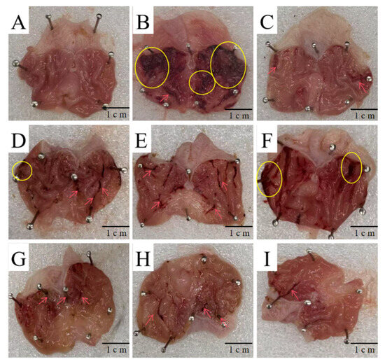 Macroscopic Observation of Gastric Mucosa((A): Blank group; (B): Model group; (C): PRE group; (D): DDP5L group; (E): DDP9L group; (F): DDP14L group; (G): DDP5H group; (H): DDP9H group; (I): DDP14H group. → indicates strip-shaped hemorrhage; ⚪ indicates severe lesion).