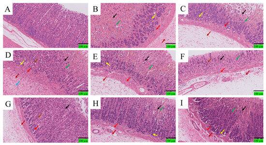 Histopathological Analysis (A): Blank group; (B): Model group; (C): PRE group; (D): DDP5L group; (E): DDP9L group; (F): DDP14L group; (G): DDP5H group; (H): DDP9H group; (I): DDP14H group. → (black arrow): Ulcer; → (green arrow): Hemorrhage; → (red arrow): Lymphocyte and granulocyte infiltration; → (brown arrow): Gastric gland epithelial cell detachment; → (dark red arrow): Loosely arranged connective tissue; → (light blue arrow): mild edema.