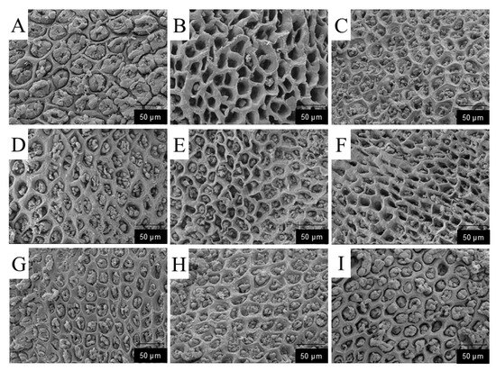Scanning Electron Microscopic Analysis of Gastric Pits ((A): Blank group; (B): Model group; (C): PRE group; (D): DDP5L group; (E): DDP9L group; (F): DDP14L group; (G): DDP5H group; (H): DDP9H group; (I): DDP14H group).