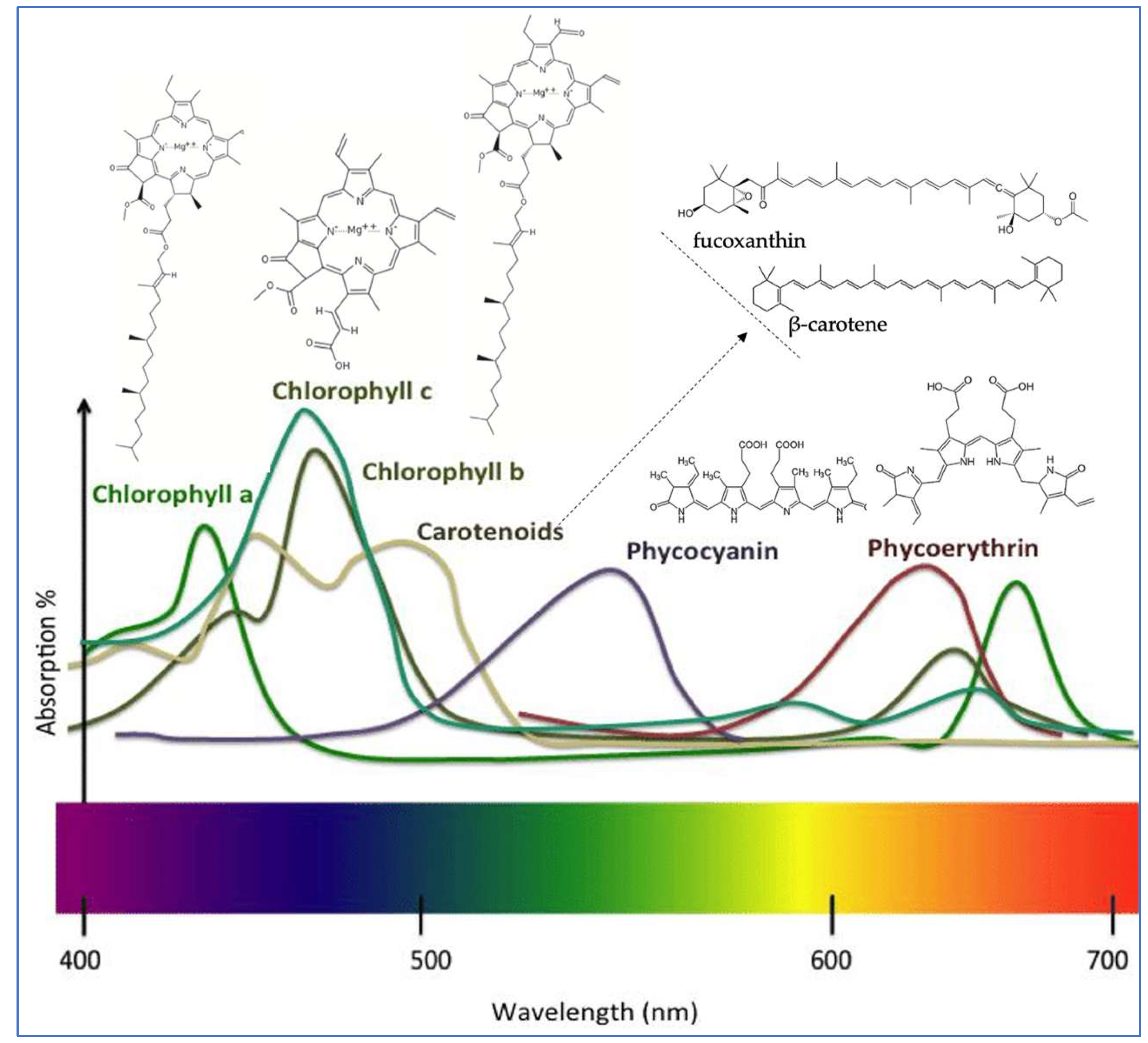 - Chini Zittelli, G.; Lauceri, R.; Faraloni, C.; Silva Benavides, A.M.; Torzillo, G. Valuable pigments from microalgae: Phycobiliproteins, primary carotenoids, and fucoxanthin. Photochem. Photobiol. Sci. 2023, 22, 1733–1789. [Google Scholar] [CrossRef] [PubMed]