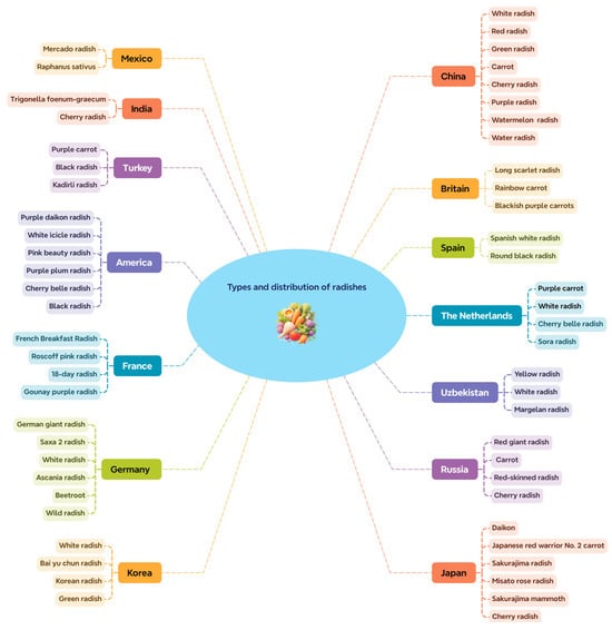 Radish (Raphanus sativus L.), also known in ancient Chinese as lai tai, hail sudden, and vegetable head, is included in the Tang Materia Medica. It is a common vegetable in the cruciferous radish genus and is a herbaceous plant with a life cycle of 1~2 years [1]. Radish has developed a rich diversity in morphology, bionomics, and genome through long-term evolution in its primary center of origin in the eastern Mediterranean and the Middle East, as well as through domestication and breeding in multiple secondary centers across Europe, Central Asia, Southern Asia, and Eastern Asia [2]. This vegetable is a very important ingredient in many cuisines, especially in Japan, China, and Korea. This is largely due to the extensive crossing and selection of radish, particularly in East Asian countries, which have produced a large number of cultivars with an especially wide variation in root shapes. While the root is most commonly used part of the plant, the fresh leaves of some cultivars are also used. Many kinds of radishes exist. Their main differences are their colors, shapes, and sizes. Every country has its own representative radish. Figure 1 shows the various types of radishes found in different countries around the world.