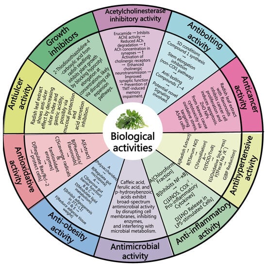 Radish leaves exhibit a remarkable spectrum of biological activities, underpinning their potential value in health and industry. The mechanisms of action of various biological activities in the radish leaves are illustrated in Figure 3. They primarily demonstrate potent acetylcholinesterase (AChE) inhibitory activity, attributed to compounds, such as erucamide, which are found in specific solvent fractions (e.g., dichloromethane). This activity suggests potential for preventing the memory impairment linked to Alzheimer’s disease. Radish leaves also possess anti-bolting activity, containing compounds that can inhibit bolting and root growth via non-COI1 pathways. The various compounds present in radish leaves, especially the various flavonoids, exhibit significant anticancer activity. Furthermore, leaf-synthesized ZnO NPs enhance anticancer cytotoxicity. Antihypertensive activity has been observed in experiments in spontaneously hypertensive rats, with the extract from radish leaves having potential for the treatment of hypertension. In terms of anti-inflammatory activity, the chloroform extract of radish leaves can inhibit inflammation by suppressing NF-kB and increasing anti-inflammatory cytokines. The phenolic compounds and sulfur-containing compounds present in radish leaves exhibit broad-spectrum antibacterial activity against both bacterial and fungal pathogens. Furthermore, the anti-obesity biological activities of radish leaves are also important. Radish leaf polysaccharides can achieve anti-obesity effects by regulating the intestinal flora and lipid metabolism. Antioxidant activities are also an important biological aspect of radish leaves, which mainly demonstrate strong antioxidant effects through phenolic substances and flavonoids.