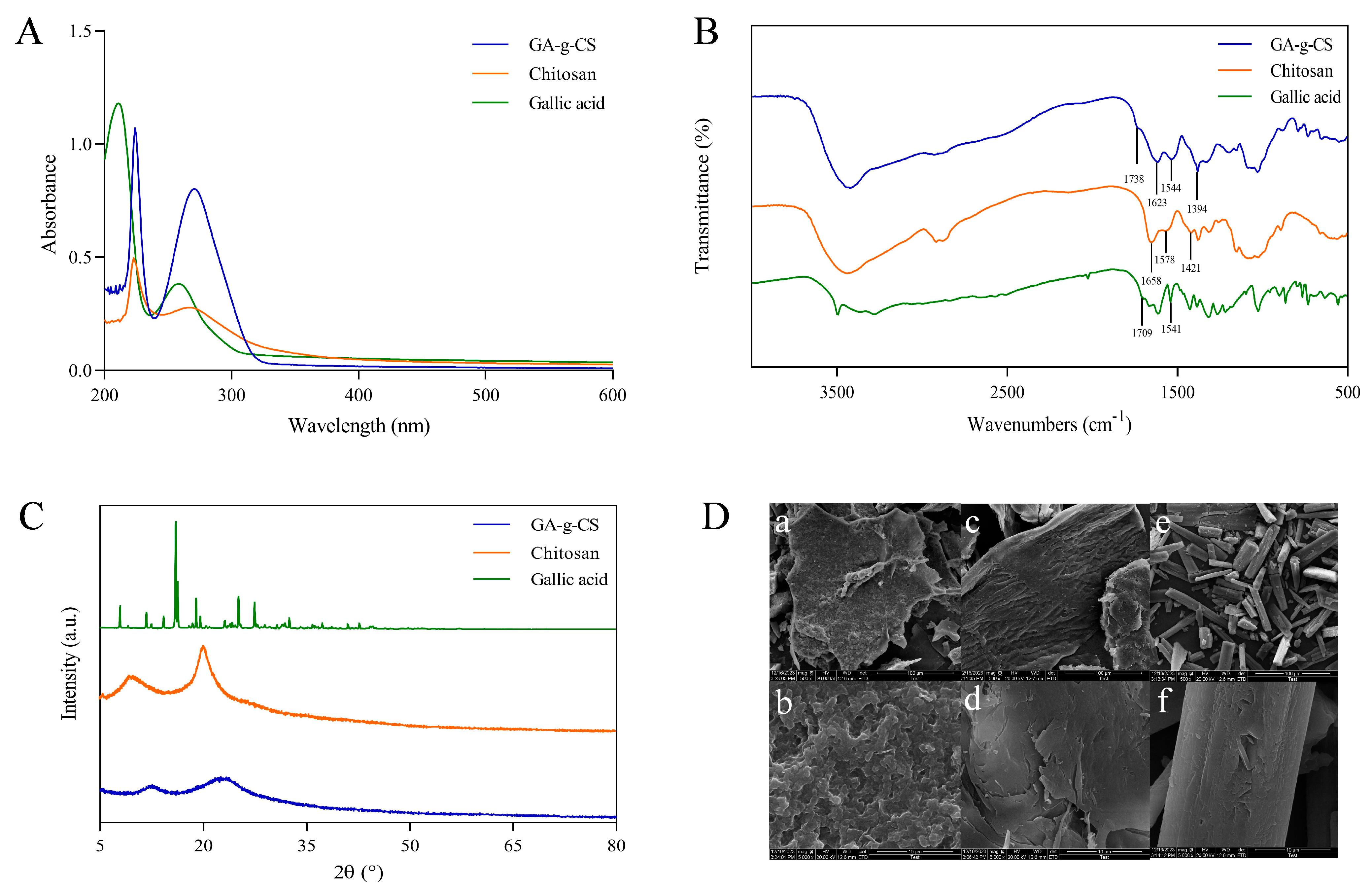 - Zhang, B.; Lan, W.; Wang, Z.; Shao, Z.; Xie, J. Modified chitosan with different phenolic acids: Characterization, physicochemical properties, and biological activity. Food Chem. 2024, 441, 138337. [Google Scholar] [CrossRef] [PubMed]
