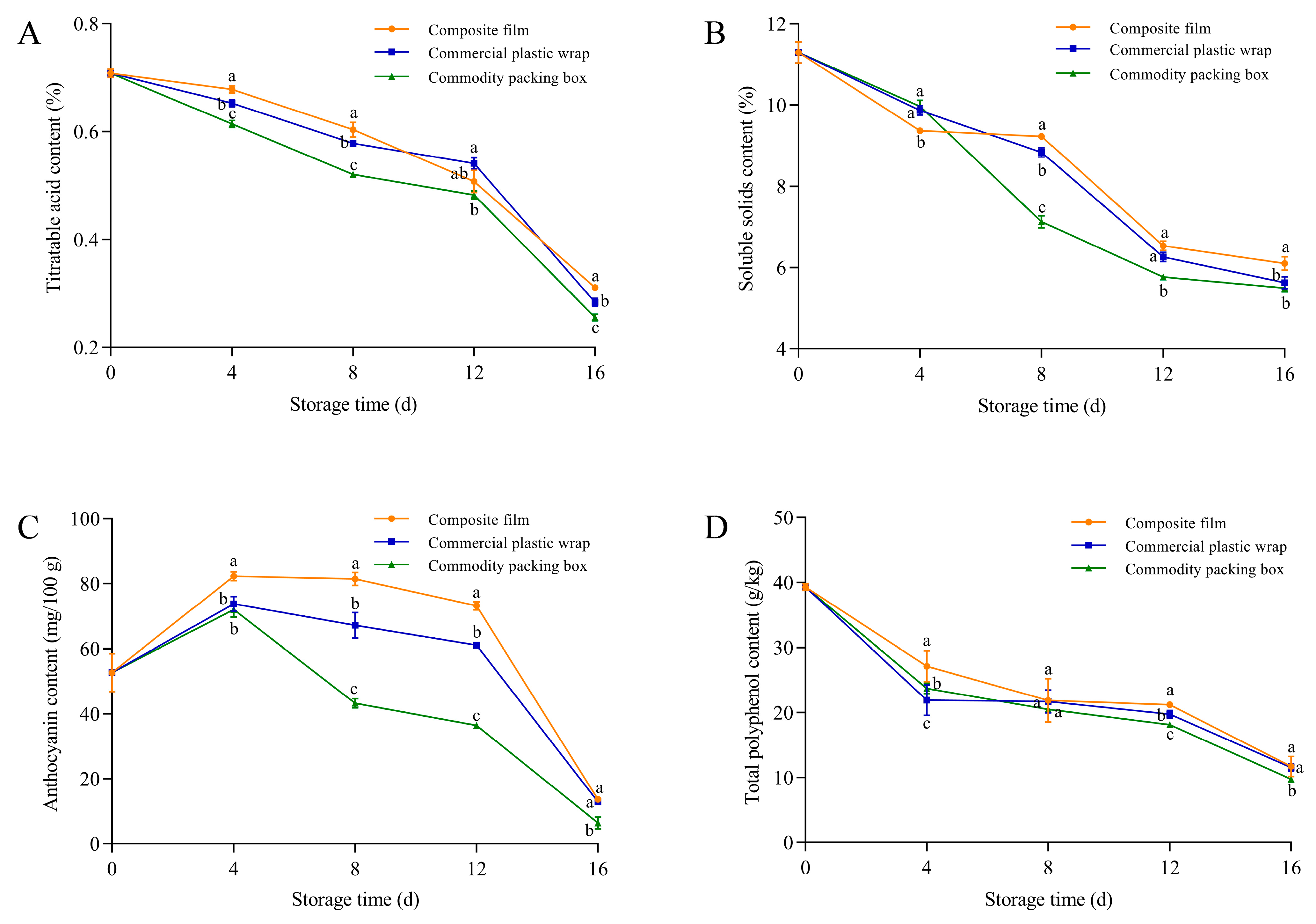 2.6.3. Effects of the GA-g-CS Composite Film on the Intrinsic Quality of Blueberries