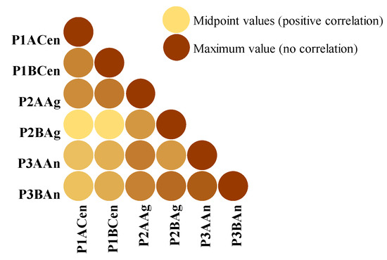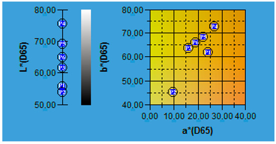 The samples of vinegar on the CIELAB map of colors (where P1—P1ACen, P2—P1BCen, P3—P2AAg, P4—P2BAg, P5—P3AAn and P6—P3BAn).