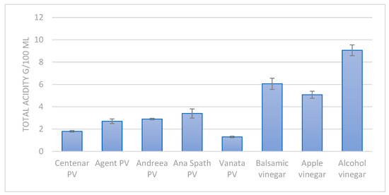 Compared with commercially available vinegars, the results show a lower acidity in the plum vinegar samples (Figure 3) in comparison with apple vinegar or balsamic vinegar. The low acidity of the plum vinegars is generated by the initial lower acidity of the fruits and the lower sugar content of the plums in comparison with apples. The mean sugar content in plums is 9 ± 1.5 g/100 g of fruit, while the mean sugar content for apples is 10 ± 1.3 g/100 g of fruit.
