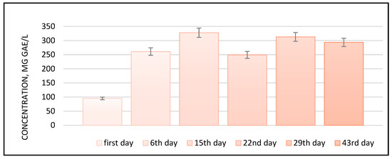 Evolution of total polyphenolic compounds in the plum vinegar sample P1ACen during the fermentation processes; p < 0.05.