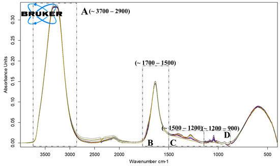ATR-FTIR analysis has pointed out the presence of four areas, A, B, C and D, representative for the principal chemical compounds found in vinegar [19]. The zone A, 3700–2900 cm−1 is attributed to the specific stretching of the O-H and C-H bonds part of water and acetic acid molecules [20], see Figure 8 and the corresponding attribution in Table 6.