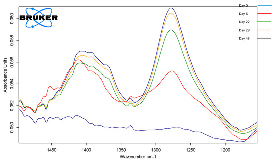 Using the absorption band between 1500 and 1200 cm−1, evaluation of the production conditions could be made since the changes in this spectral area are influenced by the processing parameters. In Figure 9, the compositional changes during the fermentation process are visible, and using a calibration curve enables the quantification of the acetic acid during formation.
