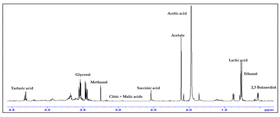 In Figure 10, the Anna Spath plum vinegar NMR spectrum is presented for exemplification and the marker signals for the main components are assessed [26,27].