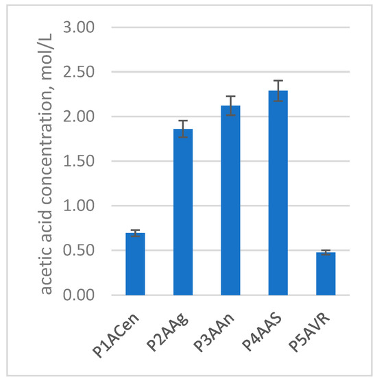 The content of organic acids is strongly linked to the organoleptic properties of plum vinegars. The plum vinegars’ acidity, expressed as acetic acid (g/100 mL), varies between 0.1 and 3.4 g/100 mL; meanwhile, pH ranges from 3.2 to 3.68, as presented in Table 4 [21]. Usually, the pH of fruit vinegars shall range within 2.4–3.9 [3] and the degree of acidity is no less than 4% acetic acid (w/v), according to international regulation standards [22]. Still, as was previously reported by Ozturk et al., 2015 [7], the majority of traditional samples (e.g., grape, apple, apricot, pomegranate, apple–lemon vinegars), were besides the imposed limit. The same principle extends to the plum vinegar samples obtained in this experimental stage, whose maximum acidity is less than 3.4 g/100 mL acetic acid.
