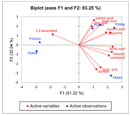 The concentration of the main components from the plum vinegars obtained by NMR analysis have been analyzed by means of Principal Component Analysis (PCA). The results presented in Figure 12 show that the plum vinegar obtained from the Anna Spath variety (P4AAS) has a distinctive composition when compared with the other four varieties, while the plum vinegar obtained from the Agent and Andreea plum varieties have a similar composition, since P2AAg and P2AAn tend to cluster in the same region. The results confirm the conclusions obtained with the classical analysis (pH, TPC, antioxidant capacity) and direct the selection decision of plums intended for producing high phenolic concentration plum vinegar towards the Anna Spath, Andreea and Agent varieties.