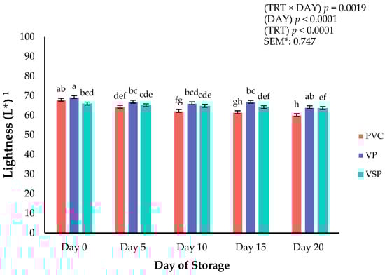 Interaction of packaging treatment × day of storage for surface lightness (L*) on boneless–skinless chicken breast. a–h Means lacking common superscripts differ (p < 0.05). * SEM, standard error of the mean. Lightness (L*) values are a measure of darkness to lightness where 100 is white, and 0 is black. Packaging treatment (N = 10/treatment): PVC—10 μm polyvinyl chloride. OTR: 14,000 mL/m/24 h. VTR: 30 g/m/24 h. VP—forming: 175 μm nylon/EVOH/enhanced polyethylene coextrusion. OTR: 0.4 ML/m/24 h. VTR: 3.3 g/m/24 h. VP—non-forming: 65 μm nylon/polyolefin plastomer coextrusion. OTR: 53.0 mL/m/24 h. VTR: 6.5 g/m/24 h. VSP—forming: 350 μm polyester/EVOH/polyethylene coextrusion. OTR: 1.8 mL/m/24 h. VTR: 2.8 g/m/24 h. VSP—non-forming: 127 μ PE/EVOH/LLDPE. OTR: 0.8 mL/m/24 h. VTR: 0.4 g/m/24 h.