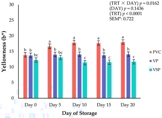 Interaction of packaging treatment × day of storage for surface yellowness (b*) on boneless–skinless chicken breast. a–c Means lacking common superscripts differ (p < 0.05). * SEM, standard error of the mean. Yellowness (b*)—a larger value indicates a more yellow color, where +60 is yellow and −60 is blue. Packaging treatment (N = 10/Treatment): PVC—10 μm polyvinyl chloride. OTR: 14,000 mL/m/24 h. VTR: 30 g/m/24 h. VP—forming: 175 μm nylon/EVOH/enhanced polyethylene coextrusion. OTR: 0.4 ML/m/24 h. VTR: 3.3 g/m/24 h. VP—non-forming: 65 μm nylon/polyolefin plastomer coextrusion. OTR: 53.0 mL/m/24 h. VTR: 6.5 g/m/24 h. VSP—forming: 350 μm polyester/EVOH/polyethylene coextrusion. OTR: 1.8 mL/m/24 h. VTR: 2.8 g/m/24 h. VSP—non-forming: 127 μm PE/EVOH/LLDPE. OTR: 0.8 mL/m/24 h. VTR: 0.4 g/m/24 h.