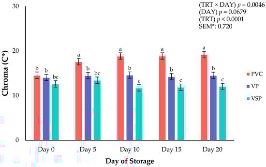 Interaction of packaging treatment × day of storage for chroma (C*) of boneless–skinless chicken breast. a–c Means lacking common superscripts differ (p < 0.05). * SEM, standard error of the mean. Chroma (C*)—total color (a larger number indicates a more vivid color). Packaging treatment (N = 10/Treatment): PVC—10 μm polyvinyl chloride. OTR: 14,000 mL/m/24 h. VTR: 30 g/m/24 h. VP—forming: 175 μ nylon/EVOH/enhanced polyethylene coextrusion. OTR: 0.4 ML/m/24 h. VTR: 3.3 g/m/24 h. VP—non-forming: 65 μm nylon/polyolefin plastomer coextrusion. OTR: 53.0 mL/m/24 h. VTR: 6.5 g/m/24 h. VSP—forming: 350 μm polyester/EVOH/polyethylene coextrusion. OTR: 1.8 mL/m/24 h. VTR: 2.8 g/m/24 h. VSP—non-forming: 127 μm PE/EVOH/LLDPE. OTR: 0.8 mL/m/24 h. VTR: 0.4 g/m/24 h.