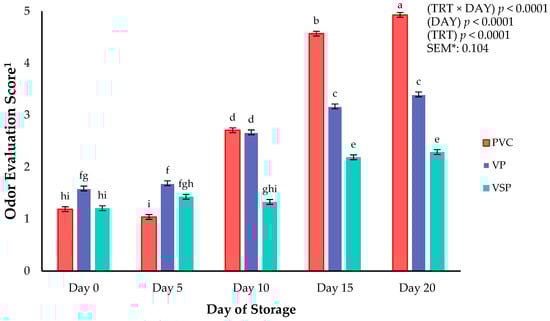 Interaction of packaging treatment × day of storage on odor evaluation scores of boneless–skinless chicken breast. a–i Means lacking common superscripts differ (p < 0.05). * SEM, standard error of the mean. 1 Odor evaluation score anchors: 1 = “fresh chicken, no off odor”; 2 = “slight off odor”; 3 = “small off odor”; 4 = “moderate off odor, unacceptable”; 5 = “extremely unacceptable, extreme off odor”. Packaging treatment (N = 7/Treatment): PVC—10 μm polyvinyl chloride. OTR: 14,000 mL/m/24 h. VTR: 30 g/m/24 h. VP—forming: 175 μm nylon/EVOH/enhanced polyethylene coextrusion. OTR: 0.4 ML/m/24 h. VTR: 3.3 g/m/24 h. VP—non-forming: 65 μm nylon/polyolefin plastomer coextrusion. OTR: 53.0 mL/m/24 h. VTR: 6.5 g/m/24 h. VSP—forming: 350 μm polyester/EVOH/polyethylene coextrusion. OTR: 1.8 mL/m/24 h. VTR: 2.8 g/m/24 h. VSP—non-forming: 127 μm PE/EVOH/LLDPE. OTR: 0.8 mL/m/24 h. VTR: 0.4 g/m/24 h.