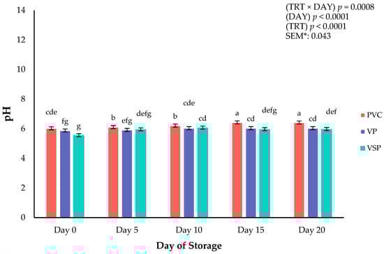 Interaction of storage packaging treatment × day of storage on pH of boneless–skinless chicken breast. a–g Means lacking common superscripts differ (p < 0.05). * SEM, standard error of the mean. Packaging treatment (N = 7/Treatment/Day): PVC—10 μm polyvinyl chloride. OTR: 14,000 mL/m/24 h. VTR: 30 g/m/24 h. VP—forming: 175 μ nylon/EVOH/enhanced polyethylene coextrusion. OTR: 0.4 ML/m/24 h. VTR: 3.3 g/m/24 h. VP—non-forming: 65 μm nylon/polyolefin plastomer coextrusion. OTR: 53.0 mL/m/24 h. VTR: 6.5 g/m/24 h. VSP—forming: 350 μm polyester/EVOH/polyethylene coextrusion. OTR: 1.8 mL/m/24 h. VTR: 2.8 g/m/24 h. VSP—non-forming: 127 μm PE/EVOH/LLDPE. OTR: 0.8 mL/m/24 h. VTR: 0.4 g/m/24 h.
