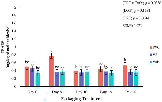 Interaction of packaging treatment × day of storage on lipid oxidation (TBARS). a–c Means lacking common superscripts differ (p < 0.05). * SEM, standard error of the mean. Packaging treatment (N = 7/Treatment/Day): PVC—10 μm polyvinyl chloride. OTR: 14,000 mL/m/24 h. VTR: 30 g/m/24 h. VP—forming: 175 μm nylon/EVOH/enhanced polyethylene coextrusion. OTR: 0.4 ML/m/24 h. VTR: 3.3 g/m/24 h. VP—non-forming: 65 μm nylon/polyolefin plastomer coextrusion. OTR: 53.0 mL/m/24 h. VTR: 6.5 g/m/24 h. VSP—forming: 350 μm polyester/EVOH/polyethylene coextrusion. OTR: 1.8 mL/m/24 h. VTR: 2.8 g/m/24 h. VSP—non-forming: 127 μm PE/EVOH/LLDPE. OTR: 0.8 mL/m/24 h. VTR: 0.4 g/m/24 h.