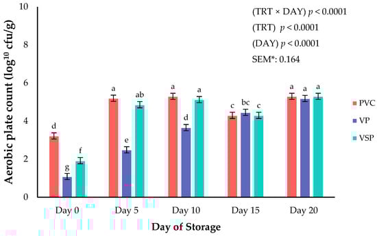 Interaction of packaging treatment × day of storage on aerobic plate count. a–g Means lacking common superscripts differ (p < 0.05). * SEM, standard error of the mean. Packaging treatment (N = 7/Treatment/Day): PVC—10 μm polyvinyl chloride. OTR: 14,000 mL/m/24 h. VTR: 30 g/m/24 h. VP—forming: 175 μm nylon/EVOH/enhanced polyethylene coextrusion. OTR: 0.4 ML/m/24 h. VTR: 3.3 g/m/24 h. VP—non-forming: 65 μm nylon/polyolefin plastomer coextrusion. OTR: 53.0 mL/m/24 h. VTR: 6.5 g/m/24 h. VSP—forming: 350 μm polyester/EVOH/polyethylene coextrusion. OTR: 1.8 mL/m/24 h. VTR: 2.8 g/m/24 h. VSP—non-forming: 127 μm PE/EVOH/LLDPE. OTR: 0.8 mL/m/24 h. VTR: 0.4 g/m/24 h.