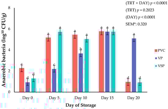 Interaction of packaging treatment × day of storage on anaerobic bacteria growth. a–d Means lacking common superscripts differ (p < 0.05). * SEM, standard error of the mean. Packaging treatment (N = 7/Treatment/Day): PVC—10 μm polyvinyl chloride. OTR: 14,000 mL/m/24 h. VTR: 30 g/m/24 h. VP—forming: 175 μm nylon/EVOH/enhanced polyethylene coextrusion. OTR: 0.4 ML/m/24 h. VTR: 3.3 g/m/24 h. VP—non-forming: 65 μm nylon/polyolefin plastomer coextrusion. OTR: 53.0 mL/m/24 h. VTR: 6.5 g/m/24 h. VSP—forming: 350 μm polyester/EVOH/polyethylene coextrusion. OTR: 1.8 mL/m/24 h. VTR: 2.8 g/m/24 h. VSP—non-forming: 127 μm PE/EVOH/LLDPE. OTR: 0.8 mL/m/24 h. VTR: 0.4 g/m/24 h.