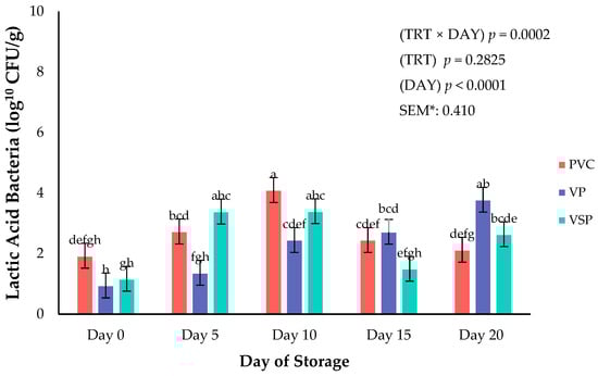 Interaction of storage duration (day) × packaging treatment on lactic acid bacteria growth. a–h Means lacking common superscripts differ (p < 0.05). * SEM, standard error of the mean. Packaging treatment (N = 7/Treatment/Day): PVC—10 μm polyvinyl chloride. OTR: 14,000 mL/m/24 h. VTR: 30 g/m/24 h. VP—forming: 175 μ nylon/EVOH/enhanced polyethylene coextrusion. OTR: 0.4 ML/m/24 h. VTR: 3.3 g/m/24 h. VP—non-forming: 65 μm nylon/polyolefin plastomer coextrusion. OTR: 53.0 mL/m/24 h VTR: 6.5 g/m/24 h. VSP—forming: 350 μm polyester/EVOH/polyethylene coextrusion. OTR: 1.8 mL/m/24 h. VTR: 2.8 g/m/24 h. VSP—non-forming: 127 μm PE/EVOH/LLDPE. OTR: 0.8 mL/m/24 h. VTR: 0.4 g/m/24 h.