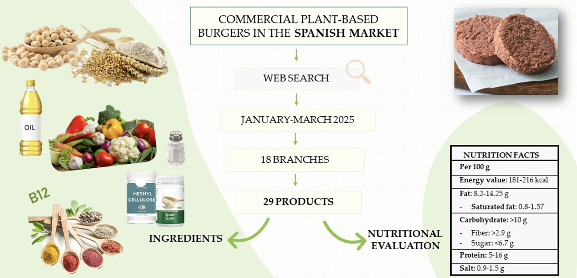 The aim of this work was to provide a concise overview of the most commonly used ingredients and the nutritional profiles of commercially available plant-based burgers on the Spanish market today (first semester 2025). All the information was collected from the labels.