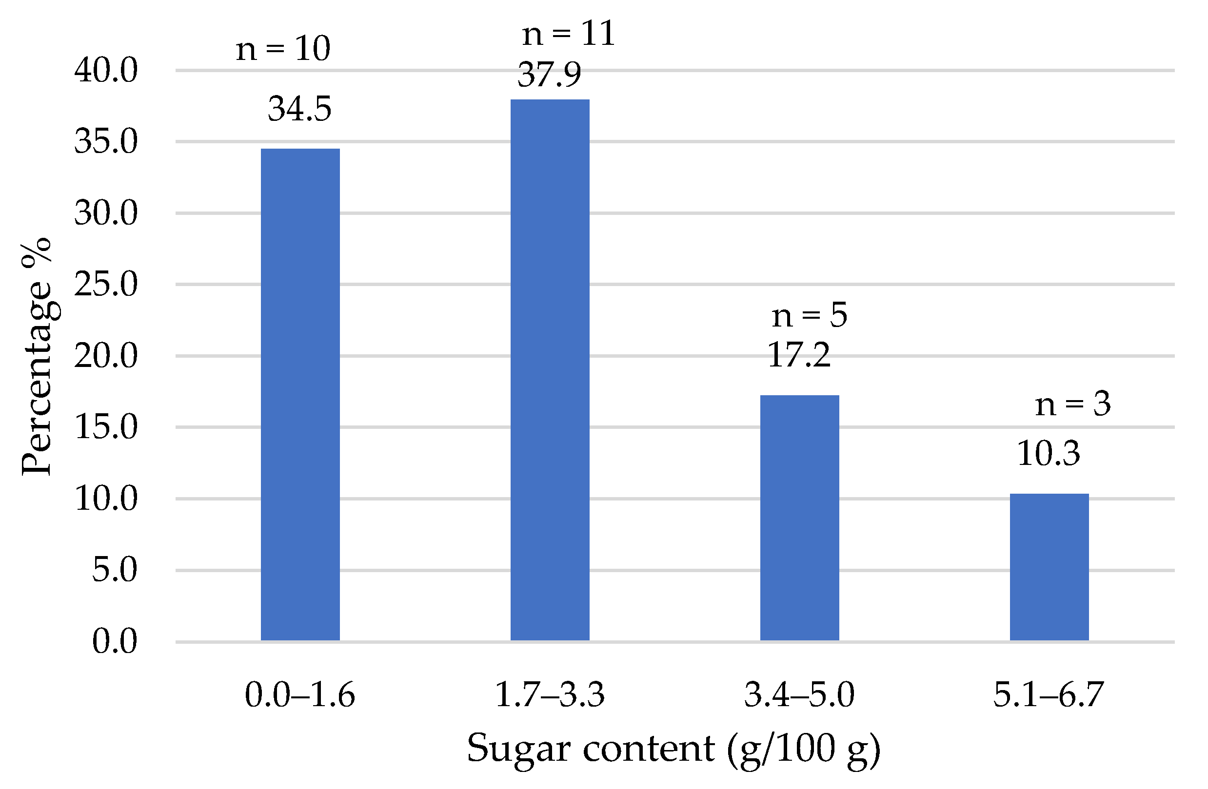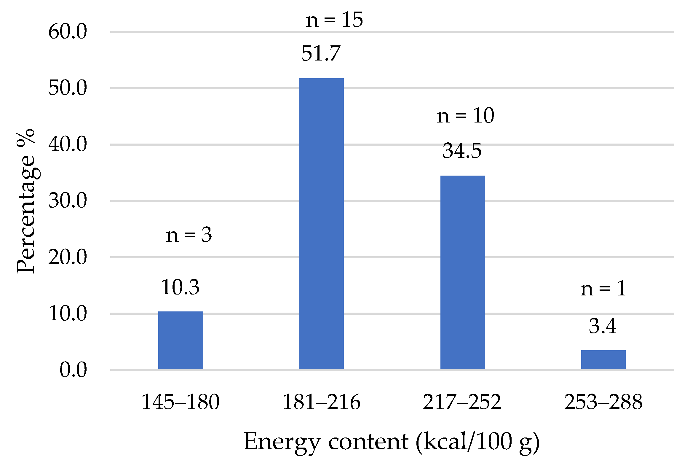 Regarding the energy content (Figure 2), more than 50% of the products (n = 15) provided between 181 and 216 kcal per 100 g.