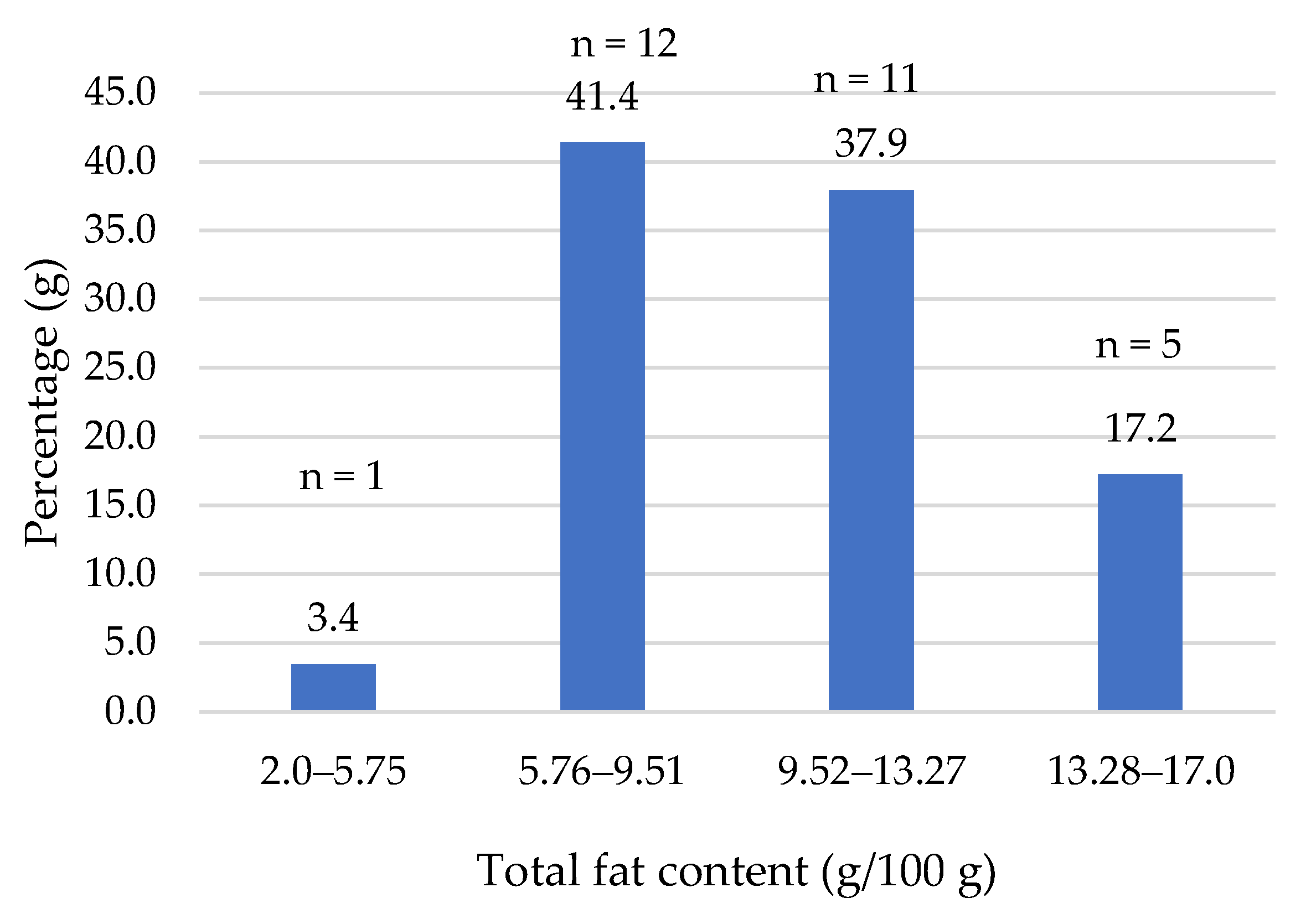 Fat is the macronutrient that provides the highest energy value. As shown in Figure 4, most of the products (80%) had a fat content ranging between 8.2 and 14.2%, with a median of 9.7% (mean of 10.0%), suggesting that their lipid supply is quite similar to that of a standard beef burger (10%, Table 5).