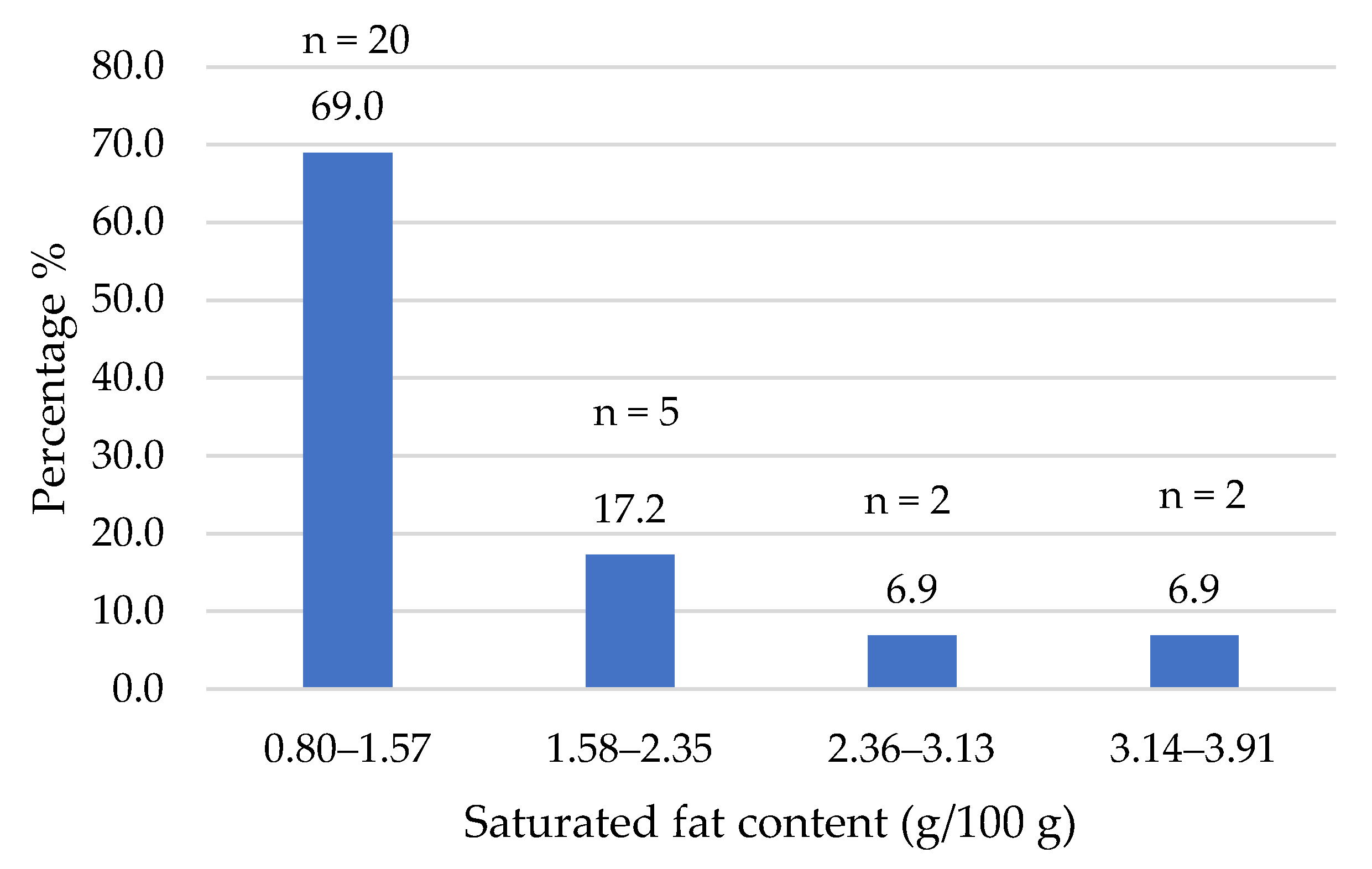 As was expected, the supply of saturated fatty acids was low, in the range of 0.8–1.57% in 69% of the burgers. Only five products showed saturated fatty acid amounts higher than 2%, with a maximum of 3.9% in one of the burgers. This low supply of saturated fatty acids, with a mean of 1.3% (median of 1.3%), is clearly a nutritional advantage in contrast with traditional beef burgers, which usually show higher amounts of saturated fatty acids (4.4%, Table 5). Previous data obtained for plant-based burgers commercialized on the Spanish market some years ago gave rise to similar values (1.9% [16], 1.25% [22]). Lima et al. [29], in a study on plant-based meat alternatives in the Brazilian market, found much higher values of saturated fatty acids (5.8%) in burger samples. According to Regulation (EC) No. 1924/2006, a nutritional claim of “low saturated fat” may be used when the total saturated fatty acid content is below 1.5% and less than 10% of the product’s energy value is derived from the sum of these fatty acids and trans fatty acids [28]; 57% of products met both criteria, suggesting that this claim could be valid for labeling. However, only three of the products showed this claim on their labels. The use of vegetable oils in the formulations of plant-based meat analogs instead of animal fats also leads to the absence of cholesterol in this type of food. Oh et al. [30] emphasized the higher content of fat, saturated fatty acids and cholesterol of beef products when compared with plant-based meat analogs on the Korean market.