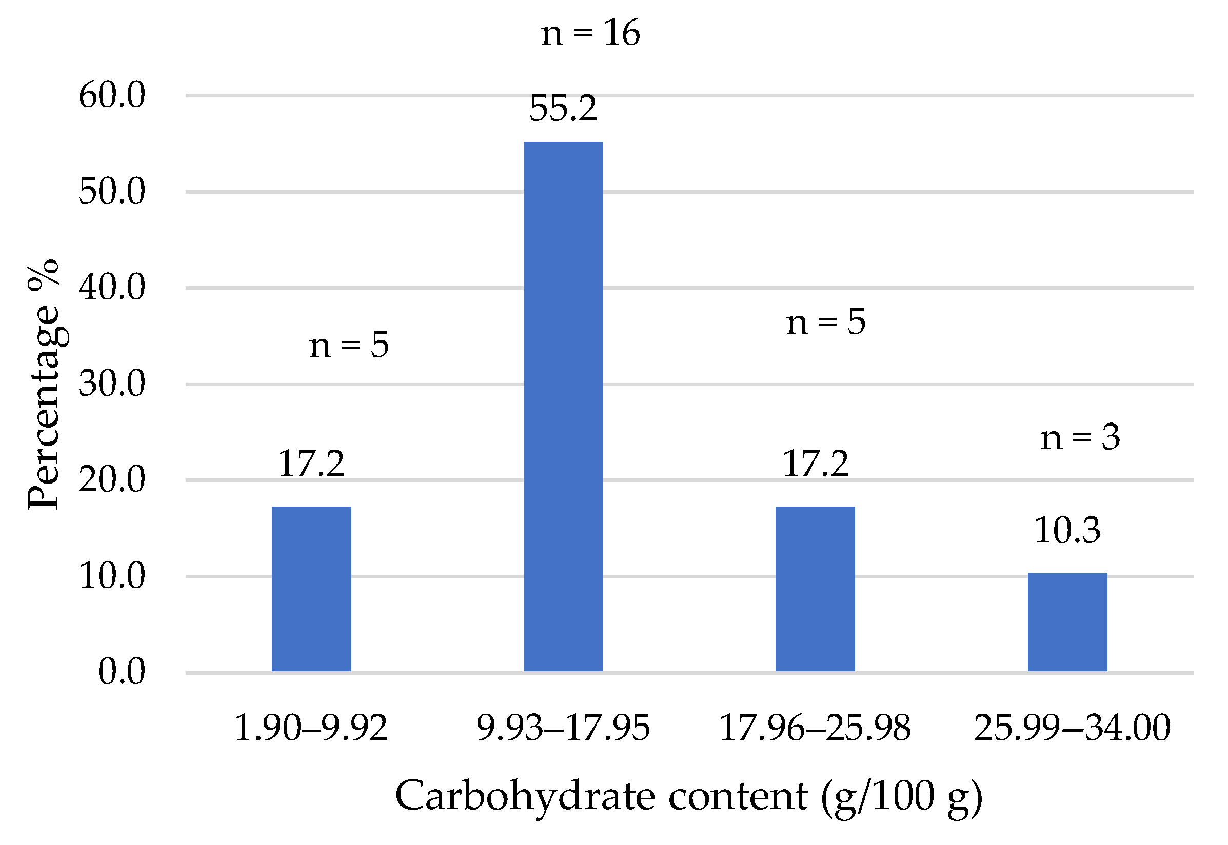 Unlike meat, which contains negligible amounts of carbohydrates, plant-based ingredients including texturized proteins, starches, vegetables, fruits, sugars, and seeds, which contribute to their carbohydrate content. In this study, 83% of plant-based burgers contained more than 10% carbohydrates, with 10% of products having between 25% and 34% (Figure 6), and a median of 14.2% (mean of 15.1%). Other studies reported a wide range of values for this parameter (1.4% to 59.7%), with a mean value of 12.1% for similar products [29]. This macronutrient significantly contributes to the energy values of the burgers.