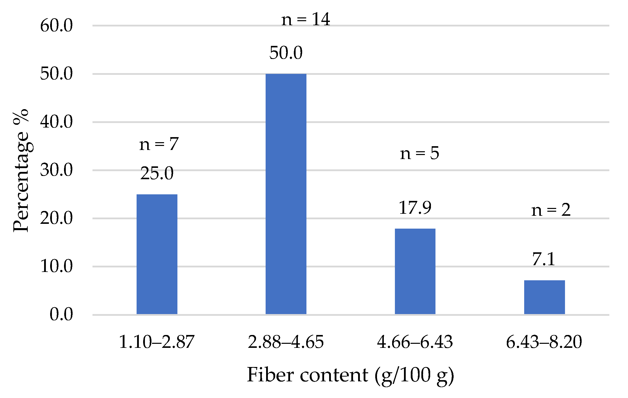 Fiber content is another important nutritional aspect of PBMAs in contrast to traditional meat products. Most products (75%) had a fiber content above 2.9% (Figure 8). The mean value for the analyzed burgers (28 in this case, as one of them did not show the fiber content on the label) was 3.7% (median of 3.7%), similar to the results found in previous works (3.5% by Costa-Catala et al. [16]; 3.8% by Bryngelsson et al. [26]; 4.0% by Rizzolo-Brime et al. [22] and Filip et al. [27]). A higher mean value was reported in Brazilian burgers (5.2%), with values ranging from 0 to 10.4% [29]. These amounts are considered significant, given that foods with ≥3% fiber can be labeled as a “source of fiber,” and those with ≥6% as “high in fiber” [28]. However, only 6 out of the 18 products with fiber content above 3% showed the claim “source of fiber”, and none of them showed the claim “high in fiber”.