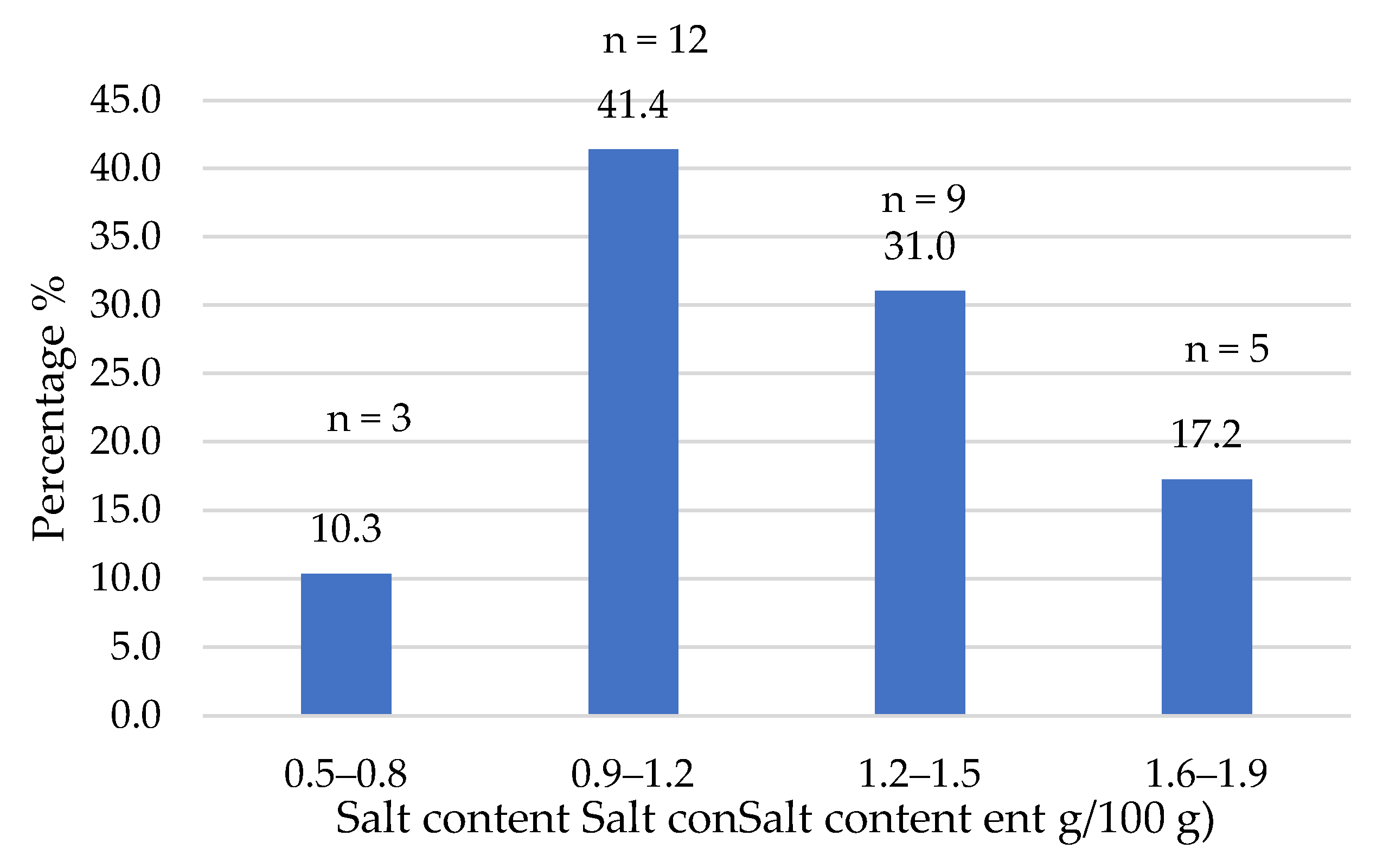 In a review that compared plant-based meat analogs with their meat counterparts, it was concluded that they typically contain higher amounts of salt [31]. In our study, over 70% of the products contained between 0.9 g and 1.5 g of salt per 100 g (Figure 9), whereas 17% contained between 1.6 g and 1.9 g. The median of all analyzed burgers was 1.2% (mean of 1.2%) salt, which is lower than the mean value of a standard beef burger (730 mg sodium, Table 5). Filip et al. [27] also found salt amounts in commercial meat burgers in the range of 0.3–2.2%. However, it is clear that the consumption of plant-based burgers does not necessarily result in lower salt intake. In plant-based foods, salt is primarily added to enhance flavor, unlike in meat products, where it also serves a preservative role due to the need for higher microbiological stability. Costa-Catala et al. [16] reported that salt was present in more than 90% of 100 meat analogs (burgers, meatballs, sausages, and nuggets) analyzed in that work, making it the most frequently used ingredient.