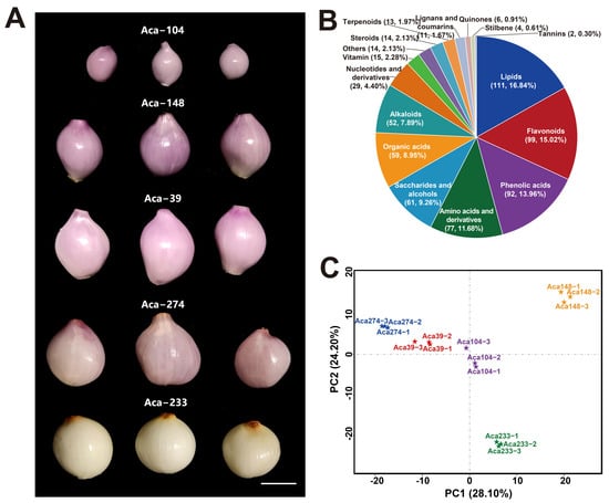 Metabolic profiling analysis of five accessions of multiplier onion. (A) Five accessions (Aca−39, Aca−104, Aca−148, Aca−233, and Aca−274) were selected for UPLC-MS/MS metabolomics analysis. (B) Sixteen groups of metabolites, including lipids, flavonoids, phenolic acids, amino acids and derivatives, saccharides and alcohols, organic acids, alkaloids, nucleotides and derivatives, vitamin, steroids, terpenoids, lignans and coumarins, quinones, stilbene, tannins, and other categories. (C) Principal component analysis of metabolites in the five accessions of multiplier onion.