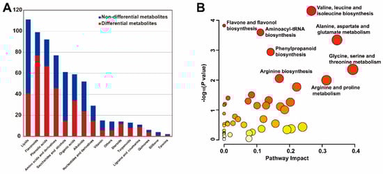 Quantitative statistical analysis and enrichment analysis of differentially accumulated metabolites (DAMs). (A) Quantitative distribution of the DAMs. (B) KEGG pathway analysis of the DAMs. The matched pathways were represented by circles. The color gradients of circles represent −log10 (p value) values, with darker colors indicating more significant changes in the metabolites associated with the corresponding pathway. Furthermore, the sizes of the circles correspond to the pathway impact scores.