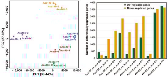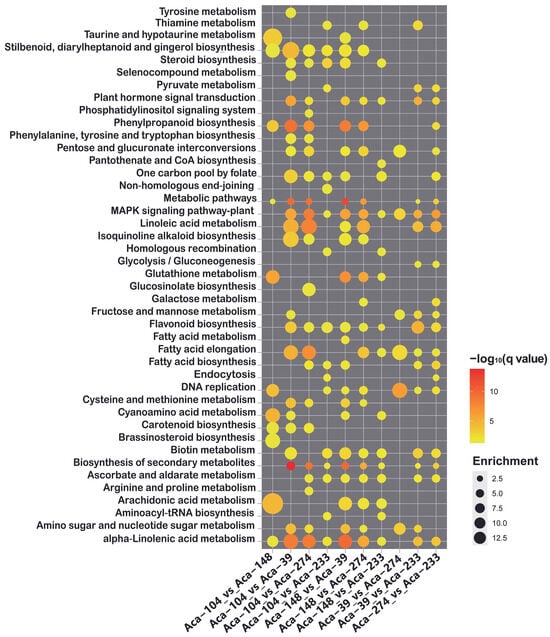 To further elucidate the regulatory mechanism and metabolite-related gene expression in multiplier onion, transcriptome sequencing was conducted on the bulbs of five core garlic accessions (Aca−39, Aca−104, Aca−148, Aca−233, and Aca−274). Principal component analysis of the entire gene expression dataset revealed a tight clustering among the three biological replicates, indicating the reliability of the RNA sequencing dataset (Figure 3A). Among these five accessions, the comparable groups (Aca-104_vs_Aca-148, Aca-39_vs_Aca-274) exhibited a small number of DEGs, while the other groups (Aca−104_vs_Aca−233, Aca−148_vs_Aca−233, Aca−39_vs_Aca−233, AcaV233_vs_Aca−274) displayed a larger number of DEGs, ranging from 4704 to 7409 (Figure 3B). This observation suggested that the gene expression levels of Aca−233 differed significantly from those of the other four accessions.