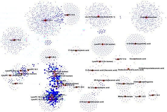 Correlation and network analysis of differentially accumulated lipids and differentially expressed genes (DEGs). The red circles denote the differentially accumulated lipids, while the blue circles represent the DEGs. Additionally, the sky-blue circles indicate transcription factors within the DEGs.