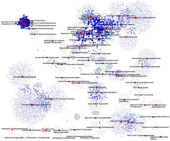 Correlation and network analysis of differentially accumulated flavonoids and differentially expressed genes (DEGs). The red circles denote the differentially accumulated flavonoids, while the blue circles represent the DEGs. Additionally, the sky-blue circles indicate transcription factors within the DEGs.