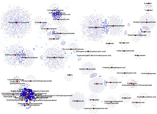 Correlation and network analysis of accumulated phenolic acids and differentially expressed genes (DEGs). The red circles denote the differentially accumulated phenolic acids, while the blue circles represent the DEGs. Additionally, the sky-blue circles indicate transcription factors within the DEGs.