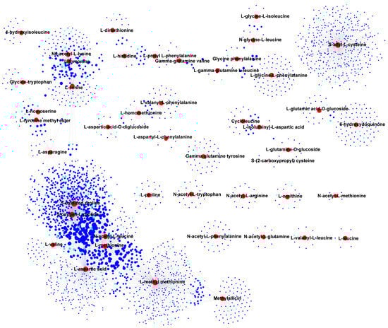 Correlation and network analysis of differentially accumulated amino acids and derivatives and differentially expressed genes (DEGs). The red circles denote the differentially accumulated amino acids and derivatives, while the blue circles represent the DEGs. Additionally, the sky-blue circles indicate transcription factors within the DEGs.