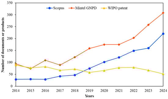 Annual trends in the number of records retrieved from Scopus (for article publications), the World Intellectual Property Organization (WIPO) (for patents), and the Mintel Global New Products Database (GNPD) (for product launches) between January 2014 and December 2024. For the Scopus data, the search was conducted using the keywords: “pet,” “dog,” “cat,” “canine,” or “feline” in combination with “probiotics.” For WIPO and Mintel GNPD, the keywords used were: “pet food,” “dog food,” or “cat food” in combination with “probiotics”.
