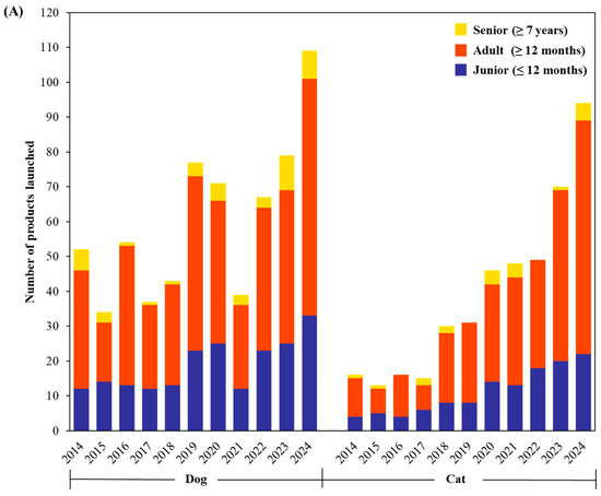 Probiotics are increasingly incorporated as functional ingredients in premium pet foods, snacks, and treats. This trend reflects the growing interest of pet owners in health, wellness, and functional nutrition. Figure 2A shows annual trends in probiotic pet food launches between 2014 and 2024, classified by life stage for both dogs and cats based on Mintel GNPD data. The “Junior” category refers to pets aged 0–12 months, “Adult” to those over 1 year, and “Senior” to those over 7 years [12]. Across the decade, probiotic products targeting adult dogs and cats represent the largest segment. The number of adult-targeted launches increased markedly after 2018, peaking by 2024, especially for dogs. This growth corresponds with heightened consumer awareness of gut health, immune function, and overall wellness maintenance in mature pets. In contrast, products formulated for juniors (puppies and kittens) represent a smaller but steadily growing segment, with modest growth observed from 2020 onwards. The lower representation in this category may be due to the short duration of this life stage and relatively lower consumer demand. Although the senior segment is still smaller than the adult category, its steady growth reflects increasing recognition of the unique nutritional and health needs of aging dogs. At the same time, the limited number of corresponding products may be due to formulation challenges, fewer feline-specific studies, and slower market adoption, highlighting a gap between research efforts and commercial outcomes.