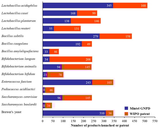 Figure 3 presents a comparative analysis of probiotic strains used in commercial pet food products based on data from Mintel GNPD and their intellectual property trends from the WIPO patent database. Probiotic lactic acid bacteria including Bifidobacterium and Lactobacillus, are widely used in food and fermented dairy products because they are generally recognized as safe (GRAS) [13]. Among Lactobacillus strains, Lactobacillus acidophilus emerges as the most dominant strain in commercial products and patents, followed closely by Lacticaseibacillus casei and Lactiplantibacillus plantarum. L. acidophilus has been reported as a potential probiotic in pet food for enhancing oral health in dogs [3] and effectively improving intestinal health in pets [6]. Although L. plantarum and L. casei have been studied for their potential to enhance immune function and intestinal health in dogs [14], their use in commercial pet food remains less common compared to L. acidophilus. This may be attributed to their traditional application in fermented foods for human consumption such as yogurt, kimchi, and sauces and others [15]. In contrast, L. acidophilus has gained broader acceptance in the pet food industry due to its stronger association with gastrointestinal health and its relatively higher tolerance to processing conditions and gastrointestinal transit in companion animals [8]. In contrast, Limosilactobacillus reuteri shows moderate product launches but surprisingly high patents due to requiring new and innovative strategies in commercial applications [16]. Bifidobacterium longum and Bifidobacterium animalis have more patents but limited product launches, indicating their perceived value in innovation and potential future applications. B. bifidum remains limited due to its low tolerance to environmental conditions during processing and in the gastrointestinal tract [17]. This results in lower survival rates and the use of this strain in functional pet food. Bacillus strains, particularly Bacillus subtilis and Bacillus coagulans, are attractive for use in commercial pet food launches and patents, not only in their health-promoting functions but also in their robustness, thermostability and resistance to acidic pH [18]. These attributes are essential for surviving heat-treated food processes and the gastrointestinal tract. Bacillus strains are well-suited for use in heat-processed pet foods such as dry kibble or baked treats [19]. In contrast, more sensitive strains like Bifidobacterium or Lactobacillus often degrade during these processes, making Bacillus a more viable probiotic candidate for dry pet food formulations [18]. Enterococcus faecium is a prevalent probiotic strain in 243 commercial pet food products and 103 patents (Figure 3). It is commonly found in the gastrointestinal tract of both dogs and cats. It can survive for months in the environment and tolerance to a range of adverse conditions including acidic pH and bile salts which enhances its viability in processed pet food matrices [8]. Pediococcus acidilactici has emerged as a novel and promising probiotic strain in the companion animal sector. Although it appears in only 11 commercial pet food products and 46 patents (Figure 3) reflect growing research interest. This strain is valued for its ability to survive and exhibit bacteriocins in the host gastrointestinal tract and effectively inhibiting bacterial pathogens [20]. Saccharomyces cerevisiae and Saccharomyces boulardii are both yeast-based probiotics. These strains are particularly relevant in digestive and immune-support formulations and offer alternative probiotic mechanisms compared to bacterial strains [21]. Saccharomyces cerevisiae is commonly referred to as brewer’s yeast or deactivated brewer’s yeast in probiotic pet food included 406 commercial products and only 181 related patents. It has been shown to offer nutritional versatility in formulating alternatives to rendered protein meals for pet foods and treats [22] and may help to reduce gut permeability in adult dogs [23]. Overall, the trends analyzed in this study reflect both current consumer and industry preferences, while also forecast the next generation of probiotic innovations in the pet food sector.