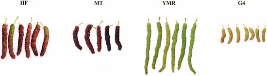 - Wu, Y.; Liu, J.; Zou, J.; Zhang, M.; Hu, Z.; Zeng, Y.; Dai, J.; Wei, L.; Liu, S.; Liu, G.; et al. Time-series analysis reveals metabolic and transcriptional dynamics during mulberry fruit development and ripening. Int. J. Biol. Macromol. 2025, 301, 140288. [Google Scholar] [CrossRef]