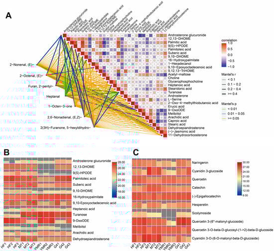 Analysis revealed that all seven key volatile compounds originated from fatty acid metabolism pathways. Furthermore, comparative analysis demonstrated that differential metabolites in ‘YMR’ relative to ‘HF’, ‘MT’, and ‘G4’ showed consistent enrichment in fatty acid metabolism pathways (Figure S4). Consequently, Mantel test analysis was performed to examine correlations between key volatile compounds and fatty acid pathway-related differential metabolites meeting significance criteria (|log2FC| > 1, VIP > 1) (Figure 3A). The analysis revealed significant correlations between sugar metabolism-related metabolites and multiple volatile compounds. Androsterone glucuronide demonstrated significant associations with (E)-2-nonenal, (E)-2-octenal, 2-pentylfuran, 1-octen-3-one, and 2(3H)-furanone, 5-hexyldihydro. Similarly, turanose exhibited significant correlations with 2-pentylfuran, (E, Z)-2,6-nonadienal, and heptanal. Among fatty acid metabolism-related metabolites, both 12, 13-DHOME and 9, 10-DHOME showed significant correlations with (E, Z)-2,6-nonadienal and heptanal. Additionally, 9-OxoODE demonstrated significant associations with (E)-2-nonenal, (E)-2-octenal, and 2-pentylfuran. The lipoxygenase pathway metabolite 9(S)-HPODE exhibited significant correlations with 2-pentylfuran, (E, Z)-2,6-nonadienal, and heptanal.