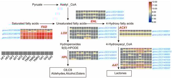 Gene expression analysis within fatty acid metabolism pathways was conducted to generate comprehensive pathway expression maps (Figure 4). Lipoxygenase expression patterns demonstrated clear accession-specific profiles. LOX3 (gene-LOC21384383) exhibited pronounced upregulation in ‘YMR’, while two distinct LOX5 isoforms showed differential expression: gene-LOC21384679 displayed elevated expression in both ‘YMR’ and ‘MT’, whereas gene-LOC21392890 was expressed across multiple accessions, including ‘YMR’, ‘HF’, and ‘MT’. Hydroperoxide lyase (HPL) expression was detected across all four M. laevigata, potentially explaining the elevated odor activity values observed for (E)-2-nonenal, (E)-2-octenal, and 2-pentylfuran in M. laevigata (Figure 2A).