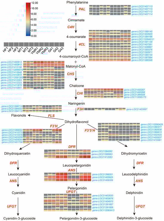 Analysis of downstream phenylpropanoid pathway components revealed distinct expression patterns among key regulatory enzymes. Flavanone 3-hydroxylase (F3H), (gene-LOC21403067) demonstrated elevated expression in ‘MT’ and ‘G4’ accessions, while flavonol synthase (FLS) genes (gene-LOC21398715, gene-LOC21384020, gene-LOC21384115) exhibited consistently reduced expression in ‘YMR’. Critical flavonoid biosynthesis enzymes demonstrated substantial expression differences across accessions. Flavonoid 3′-hydroxylase (F3′H) genes (gene-LOC21388202, gene-LOC21410275, gene-LOC21410476, gene-LOC21403209, gene-LOC21401756), flavonoid 3′,5′-hydroxylase (F3′5′H) genes (gene-LOC112090429, gene-LOC21390377, gene-LOC21399813, gene-LOC21402425, gene-LOC21405937, gene-LOC21410481), and UDP-glucose flavonoid 3-O-glucosyltransferase (UFGT) genes (gene-LOC21402630, gene-LOC21405676, gene-LOC21404970, gene-LOC21391667, gene-LOC112093413) exhibited markedly higher expression in ‘HF’, ‘MT’, and ‘G4’ relative to ‘YMR’. Additionally, dihydroflavonol 4-reductase (DFR) genes (gene-LOC21384592, gene-LOC21412083) and anthocyanidin synthase (ANS) genes (gene-LOC21396001, gene-LOC21405925, gene-LOC21409326) displayed preferential expression in ‘MT’ and ‘G4’ accessions. These expression profiles demonstrate that ‘HF’, ‘MT’, and ‘G4’ possess enhanced phenylpropanoid biosynthetic capacity compared to ‘YMR’, characterized by elevated enzyme gene expression and correspondingly greater flavonoid production potential. This genetic architecture aligns with the observed higher flavonoid metabolite concentrations in these three M. laevigata (Figure 3C).